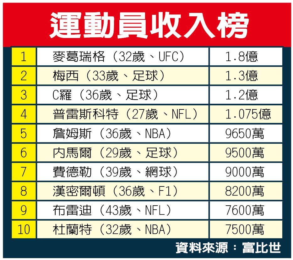 過去一年大多數職業運動暫時中斷,但32歲的愛爾蘭終極格鬥(UFC)選手麥葛瑞格(Conor McGregor)還是有辦法賺錢。根據「富比世」排名,他在過去12個月賺進1.8億元,成為全球收入最高的職業運動員。